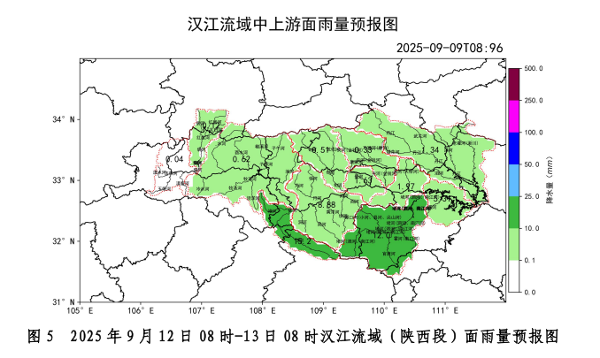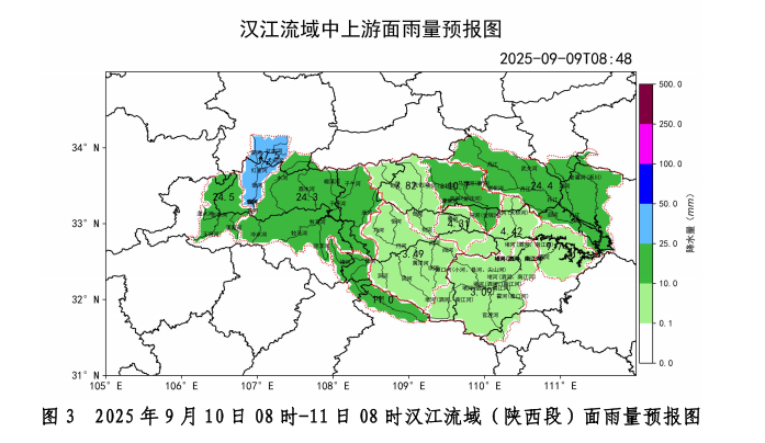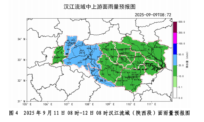 預計10日08時-11日08時漢江流域(陜西段)大部面雨量0.1~10毫米,玉帶河、酉水河、子午河、任河流域面雨量10-25毫米,褒河流域面雨量25-50毫米(圖3);11日08時-12日08時漢江流域(陜西段)褒河、酉水河、子午河、任河面雨量25~50毫米,其余中小河流流域面雨量10~25毫米(圖4);12日08時-13日08時漢江流域(陜西段)任河、堵河流域面雨量達10~25毫米,其余中小河流流域面雨量0.1~10毫米(圖5)。PC4安康新聞網(wǎng)