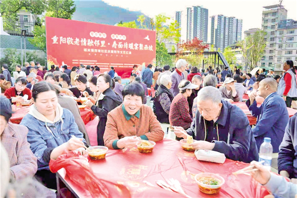 10月28日,嵐皋縣城關鎮(zhèn)西坡社區(qū)舉辦了“重陽敬老情融鄰里·壽面?zhèn)髋缇畚髌?rdquo;主題活動。廖霖 攝