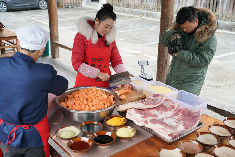 2月21日,在安康市漢濱區(qū),李花(中)在她的農(nóng)家樂(lè)院內(nèi),制作準(zhǔn)備用于網(wǎng)絡(luò)銷(xiāo)售的蒸碗,并拍攝短視頻。李花和丈夫從經(jīng)營(yíng)農(nóng)家樂(lè)起步,后通過(guò)短視頻和直播等方式,在……