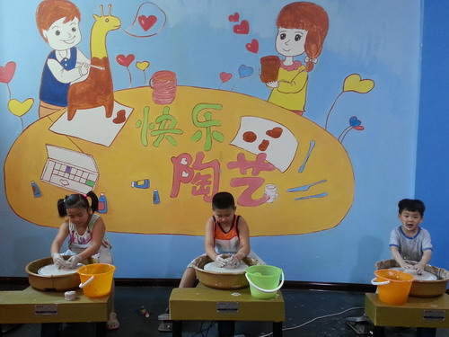 孩子們興致勃勃,當(dāng)看到展柜上擺放著各式玲瑯滿目的陶藝作品時(shí),無不欣喜萬分,贊不絕口。在認(rèn)真聽完陶藝?yán)蠋煹慕虒?dǎo)后便都迫不及待地躍躍欲試,紛紛卷起衣袖,摩拳擦掌,奔向各自的工作崗位,有的拉坯,有的塑泥,有的彩繪,忙的不亦樂乎。揉、挫、捏、摔,不一會(huì)兒,便做出了各種千奇百怪的造型,盡管這些作品還算不上精美,但卻表現(xiàn)出孩子們極大的熱情和想象力。來自安師附小的張同學(xué)一邊捏著泥巴,一邊說道:“等我做好了,就拿回去送給爸爸媽媽,讓他們看看我的杰作。”而來自安康中學(xué)的周同學(xué)則表示:“陶藝活動(dòng)很有意思,可以隨心所欲,無拘無束。”當(dāng)一件件充滿稚氣和夢想的作品成功出爐時(shí),我們和孩子們一樣心中充滿了自豪和成就感。每次活動(dòng)結(jié)束時(shí),不少學(xué)生仍意猶未盡,表示希望能在節(jié)假日和父母一起來陶藝館度過美好的一天。