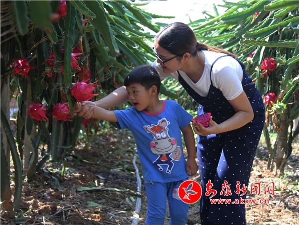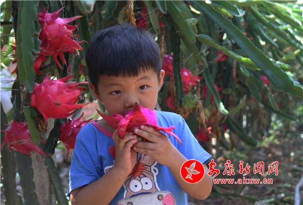 此時的王家臺村早已沒有了車水馬龍,而這里更有種“悠然見南山“的清新灑脫。微風習習,陽光正好,王浩家的小兒子在田間跑來跑去,抱著火龍果吃的正香,看到此景讓人不禁感嘆道:王家臺的火紅豐收季,到了。