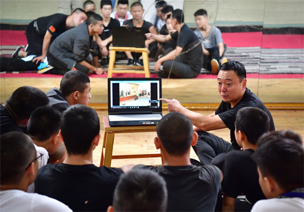 9月12日,“童子班”特聘的武戲老師、河北省京劇院國家一級演員楊向國(后排右)在練功房內與學員們觀看教學片。