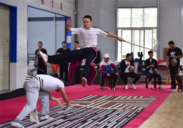 9月12日,“童子班”學員在練功房內練習翻跟頭。