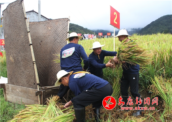 隨著一聲響亮的哨令,來自全縣12個鎮(zhèn)12支參賽隊伍展開了一場熱火朝天的田間打谷賽。割稻、打谷、捆扎、計時、稱重……隊員動作嫻熟,氣氛緊張激烈。歷經(jīng)2個小時的激烈比賽,全縣12個鎮(zhèn)打谷共計3100斤,南宮山鎮(zhèn)獲得冠軍。