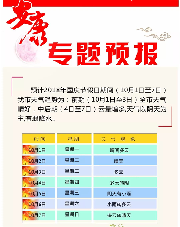 節(jié)假日期間我市天氣晴好,氣溫較適宜出游,但早晚氣溫較低,氣溫波動較大,后期受冷空氣影響,6日至7日氣溫將會有所下降。