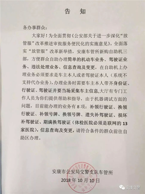 為全面貫徹落實(shí)公安部“放管服”改革新舉措,安康市公安局交警支隊(duì)車管所新購(gòu)自助機(jī)三部,方便群眾自助辦理簡(jiǎn)單的機(jī)動(dòng)車、駕駛證、違法處理、信息查詢及變更等業(yè)務(wù),車主和駕駛員本人(系統(tǒng)不支持代辦業(yè)務(wù))只需持身份證、行駛證、駕駛證,當(dāng)場(chǎng)采集車主信息、辦理業(yè)務(wù)。車管所大廳自助服務(wù)設(shè)備目前能自助辦理的業(yè)務(wù)有8項(xiàng)::補(bǔ)領(lǐng)行駛證、換領(lǐng)行駛證、補(bǔ)領(lǐng)號(hào)牌、換領(lǐng)號(hào)牌、遺失補(bǔ)駕駛證、損壞補(bǔ)駕駛證、期滿換駕駛證(體檢醫(yī)院必須是聯(lián)網(wǎng)的13家醫(yī)院),信息查詢及變更。