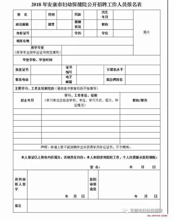 3.報(bào)名要求:應(yīng)聘人員需在報(bào)名前,登錄安康市婦幼保健院官網(wǎng)(http://www.akfy.com.cn),下載打印《2018年安康市婦幼保健院公開(kāi)招聘工作人員報(bào)名表》,用黑色中性筆填寫,提供近期2寸免冠照片2張、本人身份證、畢業(yè)證、教育部學(xué)歷在線驗(yàn)證報(bào)告、學(xué)位證、就業(yè)推薦表(應(yīng)屆生)及應(yīng)聘崗位需要的證書原件及復(fù)印件。