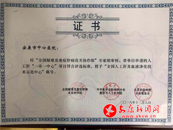 安康新聞網(wǎng)訊(通訊員 江自成 王月) 2018年12月7日-8日,第二屆“實(shí)用人工肝及血液凈化技術(shù)培訓(xùn)班暨高峰論壇”在北京召開,同時(shí)舉行了全國人工肝“一市一中心”項(xiàng)目的授牌儀式,為首批68家通過審批的醫(yī)院授牌,其中安康市中心醫(yī)院通過該項(xiàng)目評選,被授予“全國首批人工肝及血液凈化技術(shù)示范中心”稱號,同時(shí)該院也是陜西省首批獲得此稱號的單位。