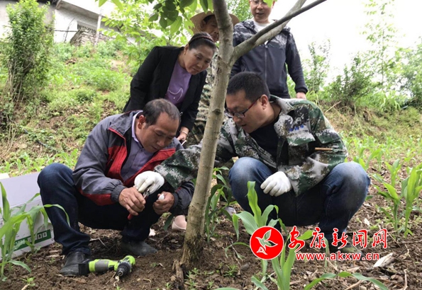 日前,高橋鎮(zhèn)雙龍村的核桃園里來(lái)了一群特殊的客人。他們沒有白大褂,而是一身迷彩的科技工作人員。手里拿著電鉆、針劑蹲在核桃樹下給村民示范講解技術(shù)要領(lǐng)。“對(duì)著果樹的根部,用電鉆斜角打孔2公分左右,剪掉針劑的頭,然后把針插進(jìn)去就好了”。“嘿!這個(gè)辦法好,簡(jiǎn)單唆!”,村名劉永宣說(shuō)到。交談中得知,劉永宣今年70歲了,家里有兩畝核桃,三四年都沒有收成。看著掛著果子,不是黑咯!就是提前掉落。以前給核桃樹打藥奏背個(gè)藥箱噴一哈,可奏是么得啥效果。眼瞅著好好的果樹,就是變不了錢,他也著急。