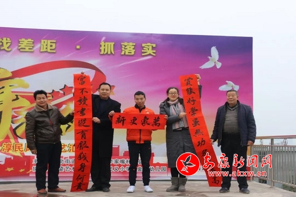 在晏臺村活動現(xiàn)場,幾張桌子一字排開,上面整齊擺放著筆、墨、紙、硯,來自區(qū)內(nèi)的書法愛好者們“老”“少”合作,神情專注,揮毫自如,橫撇豎捺間,濃濃的年味躍然紙上。“正打算買春聯(lián),這不免費(fèi)春聯(lián)就在家門口,實(shí)在太好了,我要把它貼在大門口!”一位村民拿著剛“出爐”的春聯(lián),喜上眉梢。義寫期間,李家嘴村貧困戶李輝生的兒子李強(qiáng),還請書法大師們書寫了自己創(chuàng)作的春聯(lián)——不讀書縱有銀錢身何貴,貧能好學(xué)雖無功名志氣高 。“人窮志不窮,我要用這個來鼓勵我們好好干事,好好為自己的小家打拼。”