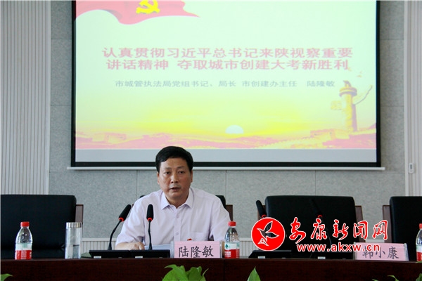 市城管執(zhí)法局黨組書記、局長、市創(chuàng)建辦主任陸隆敏以“認真貫徹習(xí)近平總書記來陜視察重要講話精神,奪取城市創(chuàng)建大考新勝利”為題,從深入學(xué)習(xí)貫徹習(xí)近平總書記來陜來安重要講話精神、緊盯目標任務(wù)決勝大戰(zhàn)大考、強化作風(fēng)建設(shè)勇于擔(dān)當(dāng)作為三個方面,結(jié)合城市創(chuàng)建、城市管理工作實際和自身學(xué)習(xí)思考,給全體黨員上了一堂內(nèi)涵豐富、思想深刻的專題黨課。