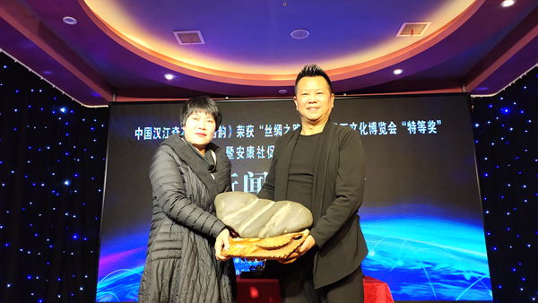 新聞發(fā)布會(huì)上,中國(guó)觀賞石鑒評(píng)師、漢江流域漢江石專(zhuān)家組成員王鐵石同志介紹漢江奇石《絲路韻》獲獎(jiǎng)情況。安康市政協(xié)原副主席李啟良、黃秀玲上臺(tái)為安康社促會(huì)奇石協(xié)會(huì)成立揭牌。安康市社促會(huì)奇石協(xié)會(huì)向石泉縣金蠶小鎮(zhèn)鎏金銅蠶博物館贈(zèng)送了漢江奇石《蠶寶寶》。