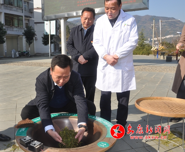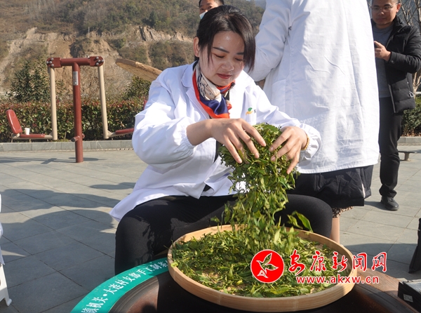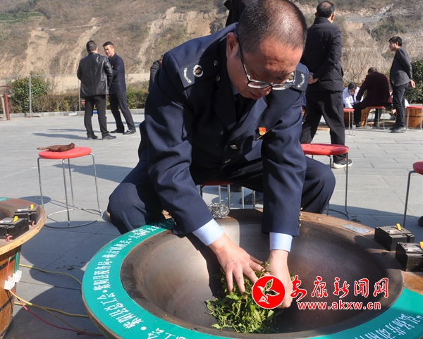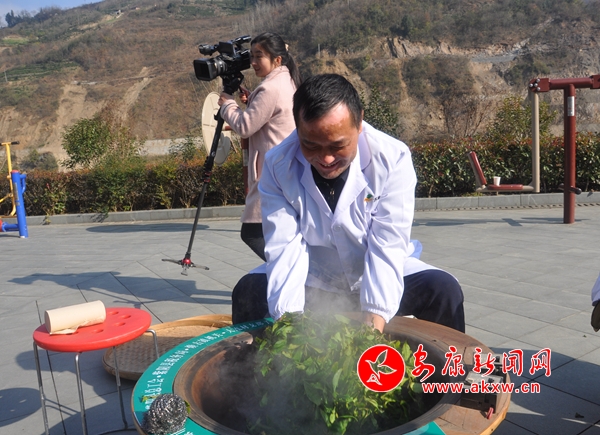 活動中,殺青、揉捻、定型,鮮嫩的茶葉在黨員干部手掌和鍋中上下翻騰,左右揉搓。經(jīng)過近兩個小時的耐心制作,成品紫陽綠茶新鮮出鍋,空氣中散發(fā)出濃濃茶香。