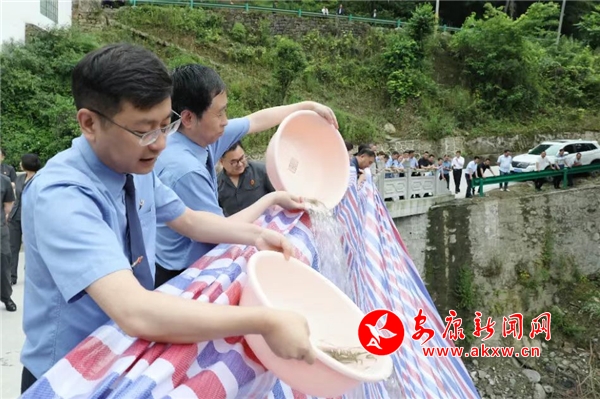 6月5日,在剛剛過去的第51個(gè)世界環(huán)境日,安康鐵檢院、安鐵法院、安康市農(nóng)業(yè)農(nóng)村局等單位在紫陽(yáng)聯(lián)合開展增殖放流活動(dòng),用三名被告繳納的野生動(dòng)物資源損失費(fèi)購(gòu)買錢魚魚苗10000余尾,投放在案發(fā)地水域,及時(shí)修復(fù)因犯罪行為而受損的任河國(guó)家級(jí)保護(hù)區(qū)的生態(tài)環(huán)境。