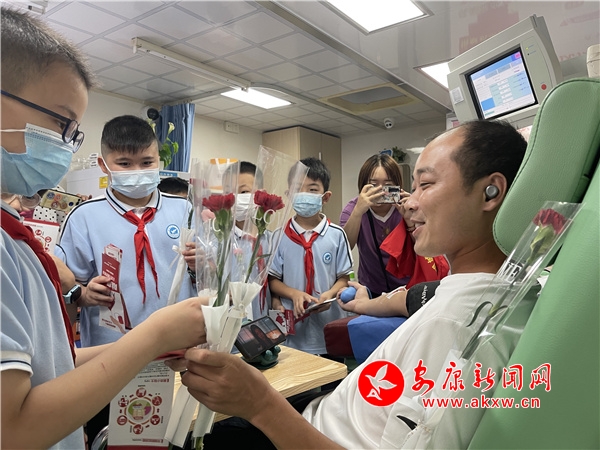 隨后,在采血車內(nèi),醫(yī)務(wù)人員從血液成分、獻血條件、獻血流程等方面為孩子們現(xiàn)場講解。孩子們?yōu)橹驹刚攉I花,表達敬意。