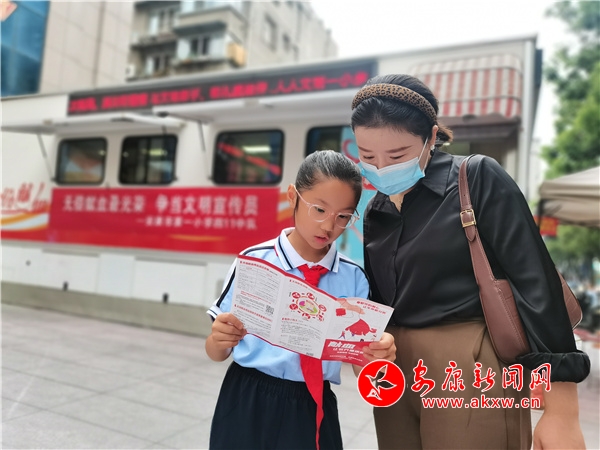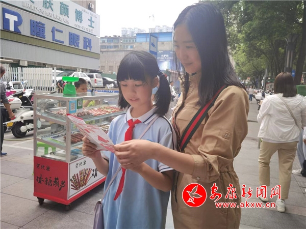 之后,孩子們拿著宣傳冊,進入商場、賓館等,向行人、工作人員分發(fā)宣傳冊。