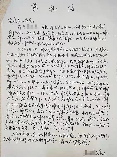 一封信,緊連著警民間的情誼;一頁(yè)信紙,書(shū)寫(xiě)著群眾發(fā)自肺腑的感謝。“感謝貴局培養(yǎng)出的好警察,感謝他們愛(ài)民為民的情懷和積極擔(dān)當(dāng)?shù)淖黠L(fēng)……”近日,安康市公安局收到一封來(lái)自山東省滕州市濱湖鎮(zhèn)屈先生一家的手寫(xiě)感謝信,字里行間滿(mǎn)是對(duì)安康市公安局漢濱分局西城派出所副所長(zhǎng)胡龍及其同事許文波心系群眾、履職盡責(zé)、為民解憂(yōu)的感激之情和贊許之意。