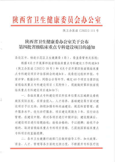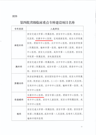 近日,陜西省衛(wèi)健委辦公室印發(fā)了《關(guān)于公布第四批省級(jí)臨床重點(diǎn)專科建設(shè)項(xiàng)目的通知》,市中心醫(yī)院神經(jīng)外科、傳染病科和檢驗(yàn)醫(yī)學(xué)科入選第四批省級(jí)臨床重點(diǎn)?平ㄔO(shè)項(xiàng)目。截至目前,我院共有省級(jí)臨床重點(diǎn)專科2個(gè)(心血管內(nèi)科、新生兒科),省級(jí)臨床重點(diǎn)?平ㄔO(shè)項(xiàng)目10個(gè)(神經(jīng)內(nèi)科、呼吸與危重癥醫(yī)學(xué)科、泌尿外科、醫(yī)學(xué)影像科、消化內(nèi)科、麻醉科、護(hù)理學(xué)、神經(jīng)外科、傳染病科、檢驗(yàn)醫(yī)學(xué)科)。
