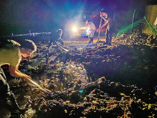 ⇑ 9月20日,嵐皋縣民主鎮(zhèn)農(nóng)田社區(qū)山洪沖上路面,鎮(zhèn)黨委、政府和社區(qū)黨支部立刻組織網(wǎng)格員、應(yīng)急搶險隊到一線抗洪搶險。陳城 攝