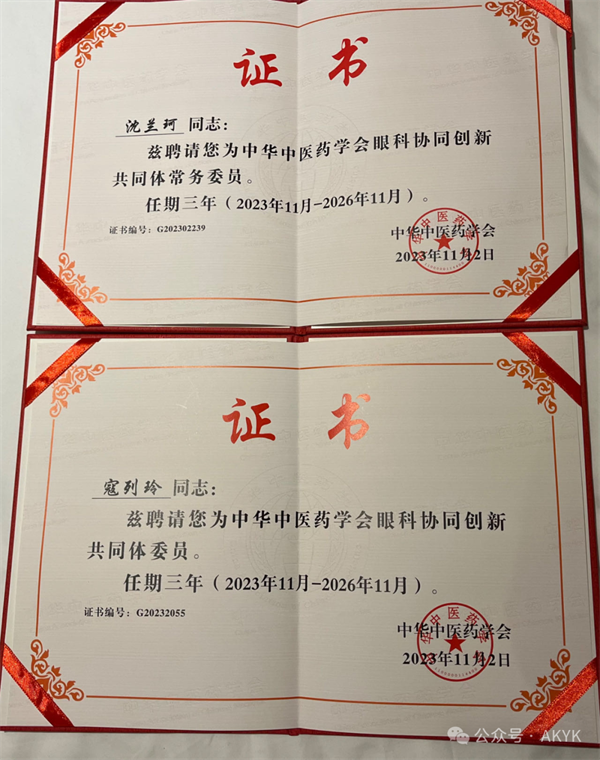 眼科醫(yī)院首席專家沈蘭珂教授被聘為中華中醫(yī)藥學會眼科協(xié)同創(chuàng)新共同體常委和陜西省中醫(yī)藥學會眼科專委會顧問、眼科醫(yī)院院院長寇列玲被聘中華中醫(yī)藥學會眼科協(xié)同創(chuàng)新共同體委員和陜西省中醫(yī)藥學會眼科專委會副主任委員、陜西省中西醫(yī)結合學會整形美容專委會副主任委員,并獲陜西省中西醫(yī)結合藥學會先進工作者;陜西省保健學會防盲專業(yè)委員會先進委員、陳利、王滿華、吉夢、張亞榮、周楊、張祥等10余人新增省中醫(yī)藥學會眼科專委會常委及委員任職。