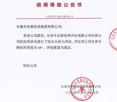 近日,經過北京中北聯(lián)信用評估有限公司綜合評定,安康市發(fā)展投資集團有限公司成功獲評AA+主體信用等級,評級展望為“穩(wěn)定”,成為我市乃至陜南地區(qū)首家獲得AA+主體信用評級的市屬國有企業(yè)。此次評級成功通過,是市委市政府全面推動“以市帶縣”整合效應的釋放,也是資本市場、信用機構對我市經濟社會發(fā)展水平和集團公司發(fā)展后勁的充分認同和肯定,將為進一步拓寬融資渠道、提高融資能力和降低融資成本創(chuàng)造有利條件。