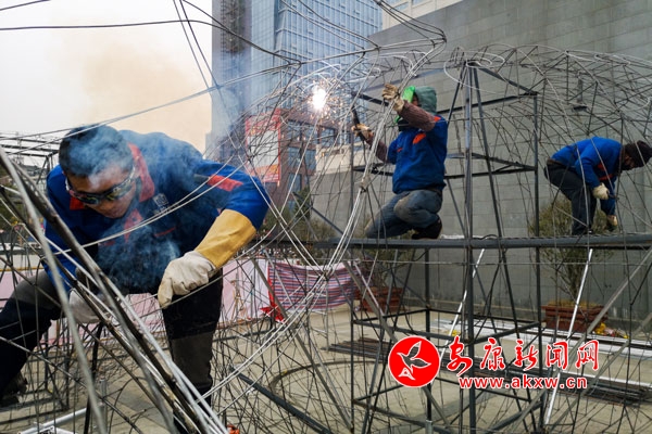 1月15日,工人們?cè)谖鞒情w制作新春主題燈飾。據(jù)現(xiàn)場(chǎng)負(fù)責(zé)人介紹,他們將會(huì)制作12組戶(hù)外燈飾,分別安裝在漢江一橋、三橋、水西門(mén)、金州廣場(chǎng)等地,扮靚一江兩岸。(潘……