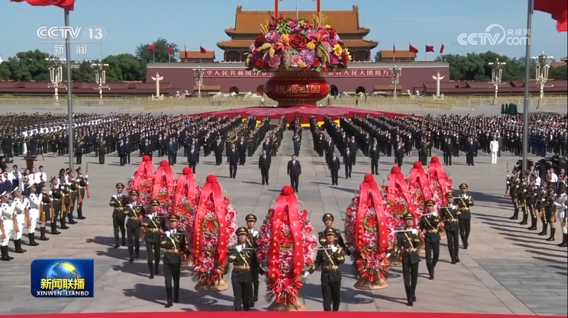 方陣前,以中共中央,全國人大常委會,國務(wù)院,全國政協(xié),中央軍委,各民主黨派、全國工商聯(lián)和無黨派愛國人士,各人民團(tuán)體和各界群眾,老戰(zhàn)士、老同志和烈士親屬,中國少年先鋒隊(duì)名義敬獻(xiàn)的9個(gè)大型花籃一字排開,花籃紅色緞帶上書寫的“人民英雄永垂不朽”格外醒目。