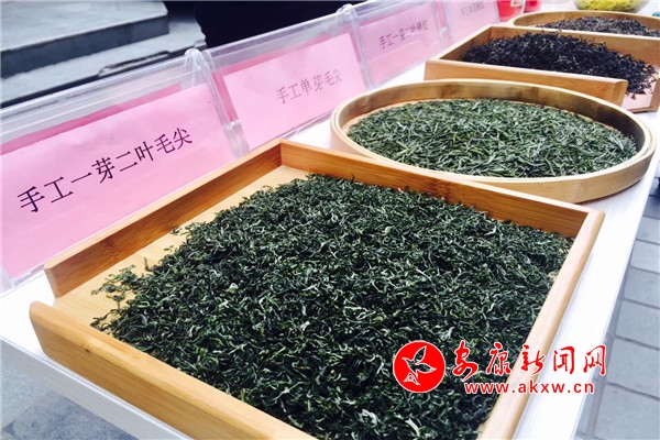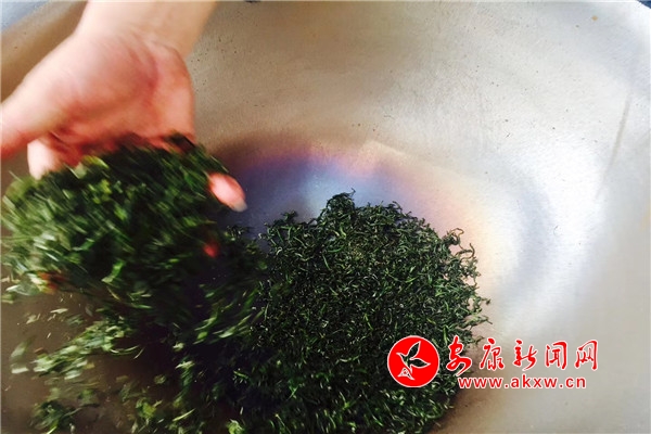 活動現(xiàn)場,三口電炒鍋一字排開,三位炒茶師傅雙手翻飛,嫩綠的鮮葉在他們手中滾動擠壓,揉捻、殺青、焙烘......最終成為我們常見的毛尖茶葉。