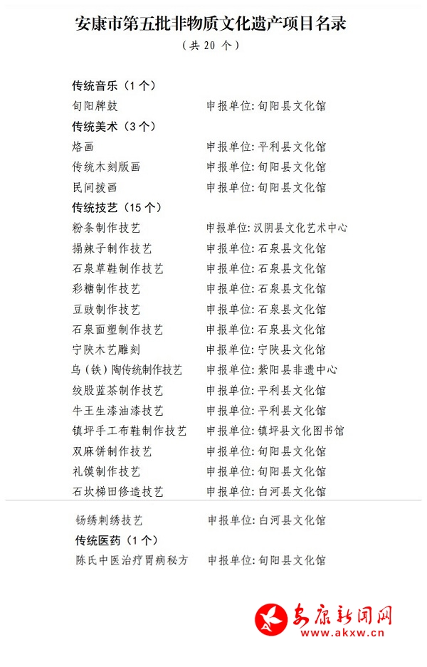 本網(wǎng)訊(實(shí)習(xí)記者 殷婷 楊一 )近日,安康市第五批非物質(zhì)文化遺產(chǎn)項(xiàng)目名錄公布。按照《中華人民共和國非物質(zhì)文化遺產(chǎn)法》和《陜西省非物質(zhì)文化遺產(chǎn)條例》相關(guān)規(guī)定,經(jīng)申報(bào)、評審、公示等程序,“旬陽牌鼓”等四大類20 個(gè)項(xiàng)目被列入該名錄,具體名單如下:Ftx安康新聞網(wǎng)