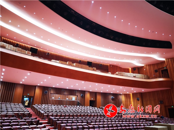 大廳右側(cè)為大劇場,左側(cè)為小劇場。大劇場的舞臺長33.6米,高24.2米,舞臺正前方配有一個長14.3米、寬13.3米的升降舞臺,劇場內(nèi)可同時容納1200人觀看演出。小劇場舞臺長18.3米,高11.3米。共有座位307個,內(nèi)部設施安裝已基本完成。