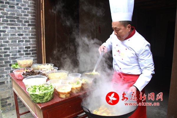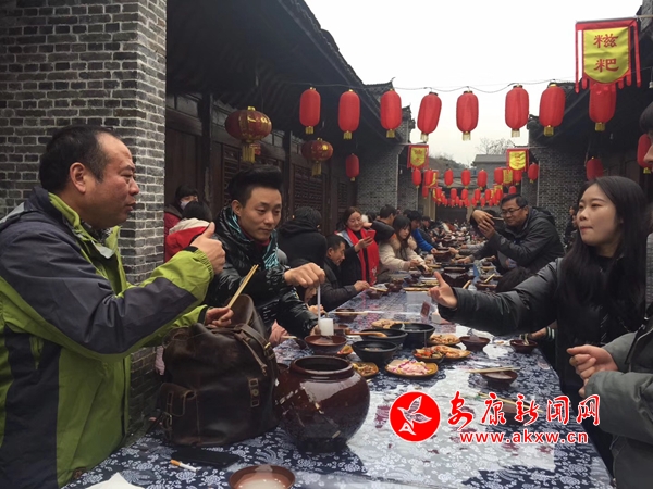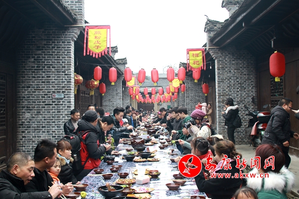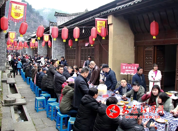 為讓各地游客品嘗到美味的漢陰名小吃,活動現(xiàn)場還舉辦了富硒美食品鑒活動。游客可通過競猜答題、幸運抽獎等方式,參與品嘗漢陰特色美食,零距離感受陜菜之鄉(xiāng)的文化氣息。在人氣爆棚的古鎮(zhèn)長桌庖湯宴上,百米長桌,游客相對而坐,特色泥碗盛滿香甜美酒,當(dāng)?shù)赜慰鸵云洫毺氐?ldquo;陜南酒拳”與親朋“切磋”助興。本次庖湯宴包含6個地方?jīng)霾恕?0個特色熱菜和2個養(yǎng)生燉菜,“金豬送福”、“肝膽香爪”、“翡翠白菜”......一道道精心準備的菜肴讓各地游客既感心意、又獲暖意,F(xiàn)場參與庖湯宴的游客不僅能享用美食,還能獲贈新春對聯(lián)一副,收獲滿滿的古鎮(zhèn)祝福。