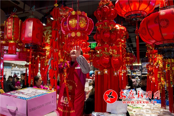 喜盈門超市的工作人員王曉燕正在掛燈籠,紅艷艷的對聯(lián)、門花、燈籠、掛飾顯出一派熱鬧的新春氣象,王曉燕說最近生意好、銷量大,春節(jié)也正常營業(yè),一直到大年初六工作人員都輪流上班。