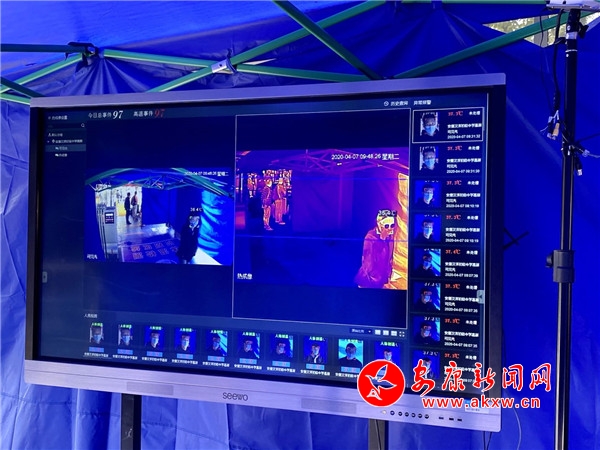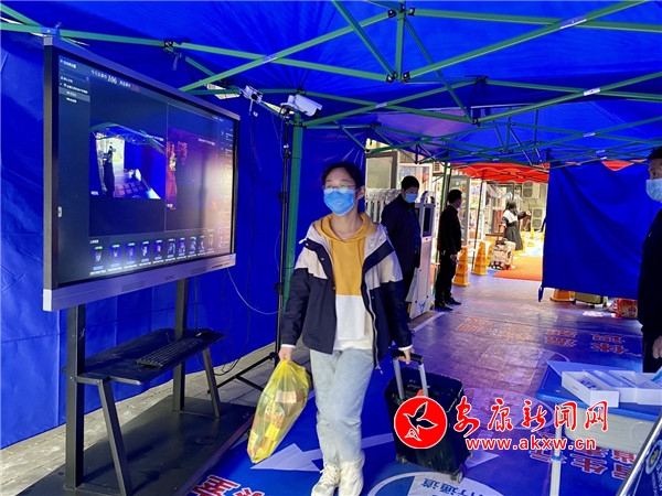 在漢濱初中高新校區(qū)校門(mén)口,記者看到學(xué)生們戴著口罩保持著安全距離在排隊(duì)進(jìn)入校內(nèi),旁邊還有很多幫孩子拿行李的家長(zhǎng)在向他們交代相關(guān)注意事項(xiàng)。排在前列的學(xué)生有序?qū)⒆约旱慕】敌畔⒈斫唤o負(fù)責(zé)檢查的工作人員核對(duì),通過(guò)之后會(huì)進(jìn)入一個(gè)設(shè)有熱成像紅外線人體測(cè)溫儀的檢測(cè)點(diǎn),每個(gè)從里面經(jīng)過(guò)的學(xué)生體溫都會(huì)出現(xiàn)在測(cè)溫儀的大顯示屏上,工作人員緊盯著屏幕排查異常人員。