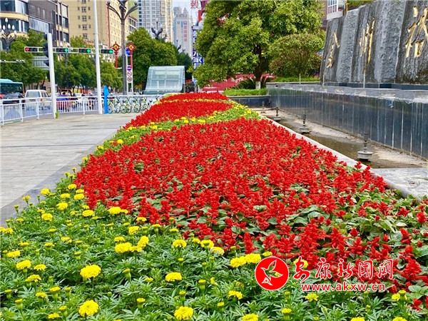記者發(fā)現(xiàn)除了街道旁擺放有鮮艷的五星紅旗,中心城區(qū)許多路段也陳設(shè)了很多色彩亮麗的鮮花。