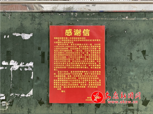 11月23日早上6:50分左右,安康市第二中學高二學生石夢林像往常一樣去上課。在經(jīng)過安康市人民醫(yī)院十字路口時,他看到一輛疾馳而過的三輪車將一人(李先生)撞倒在地,司機未理會傷者,準備逃逸。石夢林毫不猶豫地向肇事車追去,試圖阻攔。奮力追逐二百余米后,未能阻攔成功。他又立即返回,將傷者扶至路邊,用自己手機撥通了報警電話,詢問了傷者家人聯(lián)系方式,聯(lián)系上家屬后將傷者送往醫(yī)院救治。