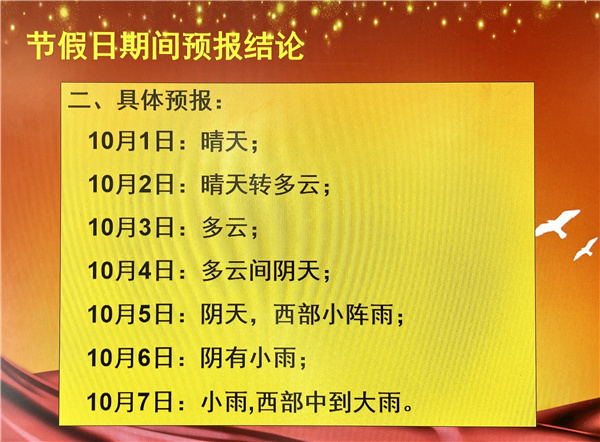 10月1日:晴天;10月2日:晴天轉多云;10月3日:多云;10月4日:多云轉陰天;10月5日:陰天,西部小陣雨;10月6日:小雨;10月7日:小雨,西部中到大雨。
