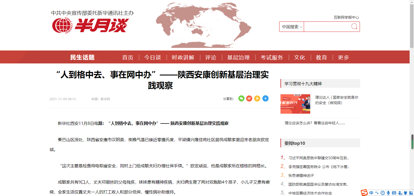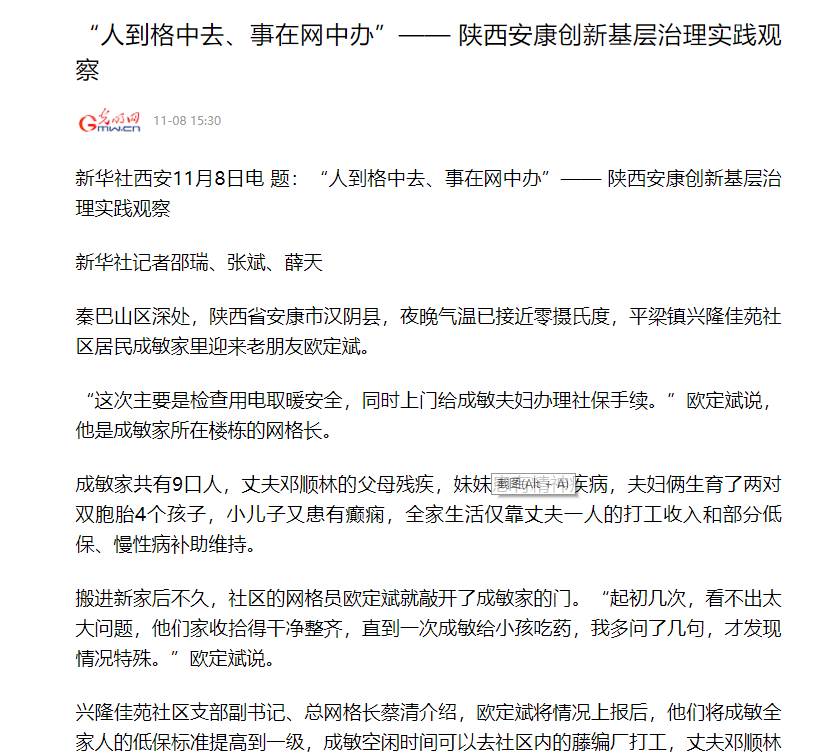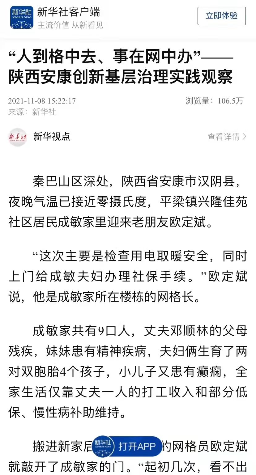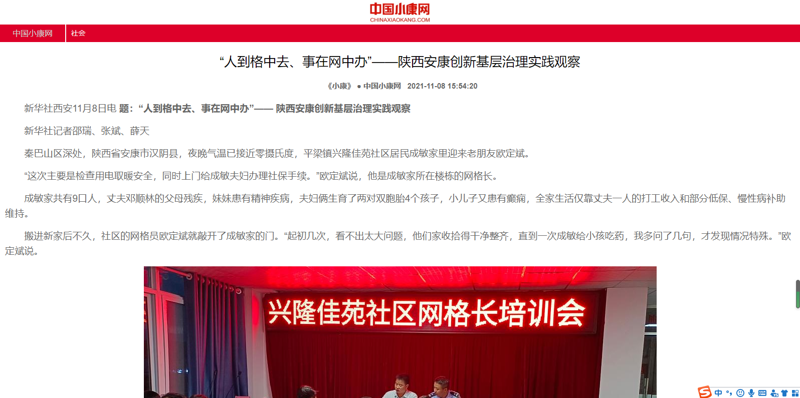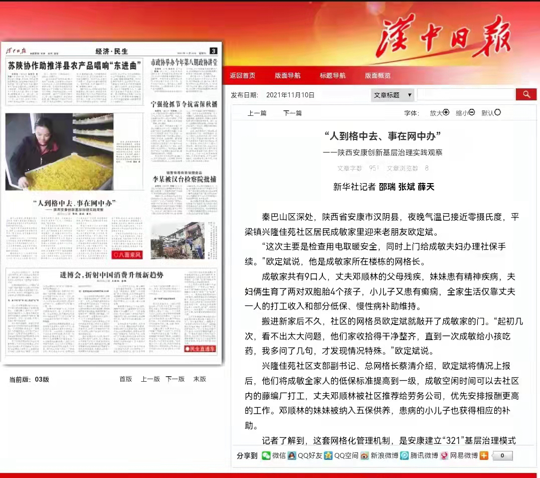 該模式是我市積極探索基層治理的生動(dòng)實(shí)踐,已在全市推廣。稿件發(fā)出后,新華網(wǎng)、光明網(wǎng)、半月談、中國(guó)小康網(wǎng)、21CN新聞、湖北日?qǐng)?bào)等80余家中省市媒體紛紛轉(zhuǎn)載,進(jìn)一步提升了我市“321”基層治理模式在全國(guó)范圍內(nèi)的影響力。一起來看看新華社記者眼中的安康基層治理實(shí)踐。