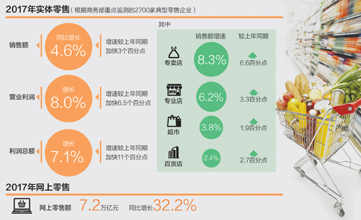商務(wù)部近日發(fā)布的數(shù)據(jù)顯示,去年我國(guó)實(shí)體零售發(fā)展態(tài)勢(shì)良好,重點(diǎn)監(jiān)測(cè)的2700家典型企業(yè)銷(xiāo)售額同比增長(zhǎng)4.6%,增速較上年同期加快3個(gè)百分點(diǎn)。去年我國(guó)網(wǎng)上零售額突破7.2萬(wàn)億元,同比增長(zhǎng)32.2%。
