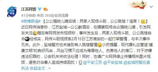 2月26日9時3 3分,江蘇省公安廳網絡安全保衛(wèi)總隊官方微博“江蘇網警”對此辟謠,“經核實,網傳斗毆視頻系2月15日江蘇淮安的一起打架警情,與本次事件無關。此外,鹽城警方也未接到有人跳樓警情!