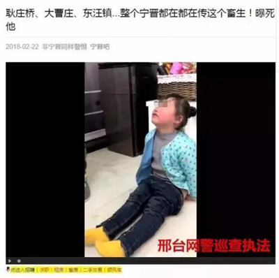 2月11日,某公益服務支持中心微博發(fā)布一段視頻,視頻畫面中一位父親對年幼的女兒拳打腳踢,并且脫掉孩子褲子用鐵衣架抽孩子屁股。該微博發(fā)出呼吁稱,“萬能的微博!請幫忙找到她!請先帶去醫(yī)院檢查一下!虐待兒童不是家務事。