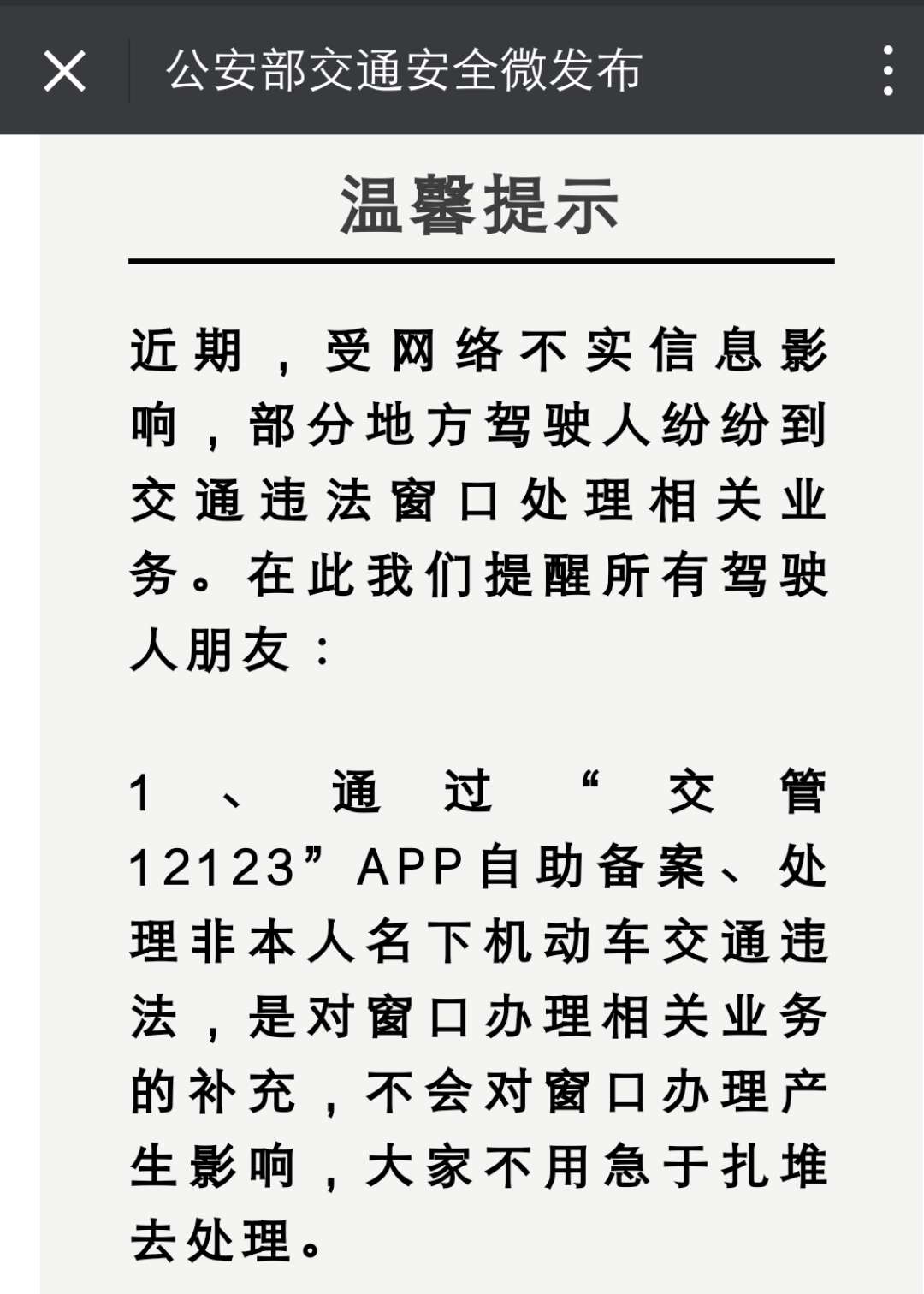 2月26日,公安部交通管理局通過官方微信發(fā)布文章,對新增項目推出后群眾提出的問題進行答疑,并提醒駕駛人朋友稱“通過‘交管12123’APP自助備案、處理非本人名下機動車交通違法,是對窗口辦理相關業(yè)務的補充,不會對窗口辦理產生影響,大家不用急于扎堆去處理。”同日,北京交警也通過官方微信辟謠稱“3月1日起,不綁定備案就不能處理非本人名下車輛違法”系誤讀,并提示:在北京市,不通過網上渠道處理非本人名下機動車交通違法的車主,依然可以通過各交通支、大隊執(zhí)法站窗口辦理。