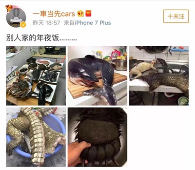 2018年2月15日(除夕)晚7時,微博賬號為“一車當先cars”的博主發(fā)布了一條名為“別人家的年夜飯……”的消息,并配發(fā)一組擺放在廚房里待烹制的熊掌、穿山甲、鱷魚等野生動物的照片,引發(fā)了網民的廣泛關注和大量轉發(fā)。