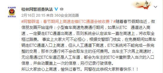 春節(jié)假期,微信朋友圈謠傳:小型客車高速免費通行期間,如果從ETC通道進入高速,一定要走ETC通道出高速,否則系統(tǒng)會認定該車一直在高速上,將收取全程過路費。