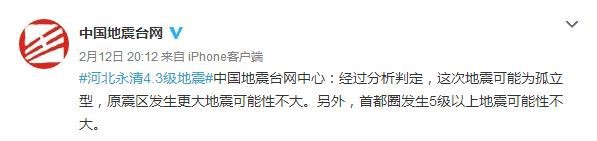 朋友圈內傳播一條假冒官方通知的消息稱“檢測局緊急通知,因地殼變動今晚津京冀地區(qū),八點到凌晨六點有間接性地震發(fā)生,3~5級,請大家做好避震準備以防有危險發(fā)生。檢測局2018.2.12 16點40分通知”。12日20時02分,中國地震臺網官微發(fā)布消息稱,“經過分析判定,這次地震可能為孤立型,原震區(qū)發(fā)生更大地震可能性不大。另外,首都圈發(fā)生5級以上地震可能性不大”。并提醒大家“遇到地震傳言時請不信謠、不傳謠!”