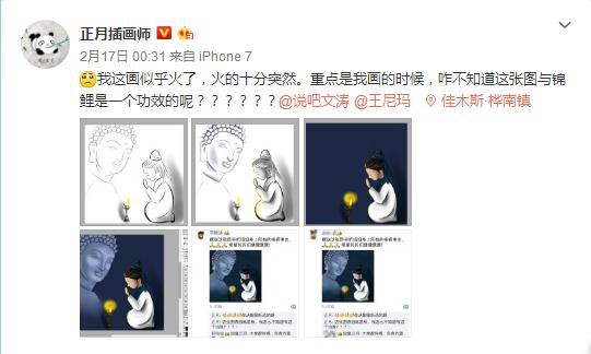 17日凌晨,該圖的原作者“正月插畫師”,微博認證為“插畫師、美術教師”,發(fā)布消息稱“我這畫似乎火了,火的十分突然。重點是我畫的時候,咋不知道這張圖與錦鯉是一個功效的呢??????”
