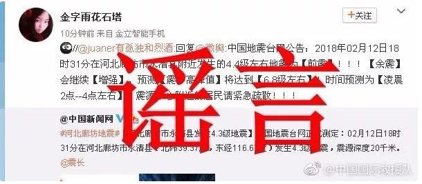 2月12日,河北永清地震發(fā)生不久后,網上有消息稱該縣“9958應急救援隊接到通知,今晚11點30分有余震活動。”12日19時57分,河北省廊坊市人民政府新聞辦官微“廊坊發(fā)布”對此辟謠稱,“純屬謠言,公安部門正在追查謠言的源頭,請廣大群眾勿信勿傳謠言,以權威發(fā)布為準!
