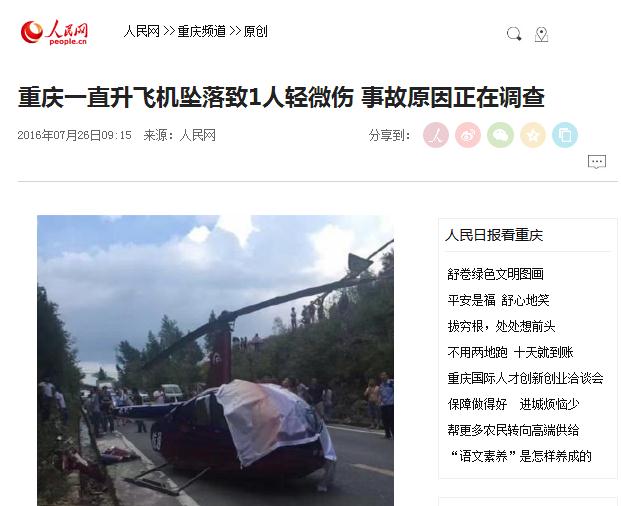 2016年7月25日16時左右,山東齊翔通用航空有限公司一架通用直升機(jī)在重慶市石柱縣黃水鎮(zhèn)青杠坪進(jìn)行空中廣告飛行,當(dāng)直升機(jī)升空10米左右時,飛機(jī)出現(xiàn)故障,緩緩下降,直升機(jī)在接近地面時,撞到障礙物致使失控著地。機(jī)上乘坐4人,其中1人受輕微傷,無建筑物受損。