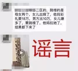 【傳聞】某某小區(qū),女兒出嫁,媽媽要十八萬,男方只出十萬,女兒跳樓,媽媽沒拉住一起掉下來,太可惜了。并配有跳樓視頻和圖片。