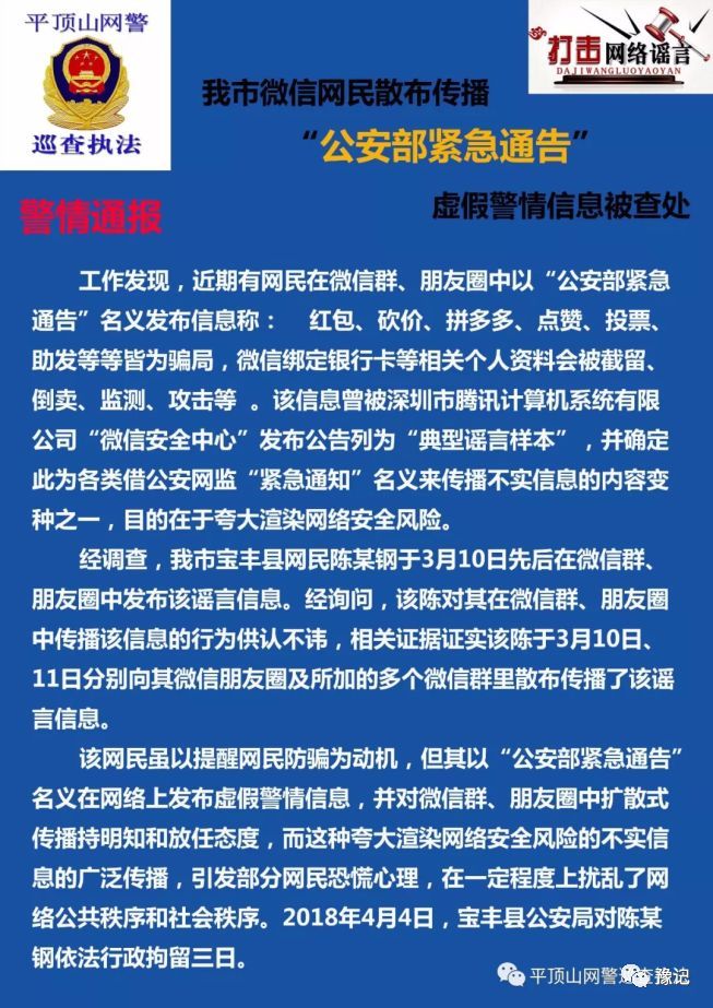 【真相】4月5日,河南平頂山網(wǎng)警官微通報稱,該市寶豐縣網(wǎng)民陳某鋼與3月10日、11日在網(wǎng)絡(luò)上發(fā)布并傳播上述“公安部緊急通告”的謠言信息,經(jīng)過警方詢問,陳某鋼對其在網(wǎng)上散播謠言信息的行為供認(rèn)不諱,被依法行政拘留三日。