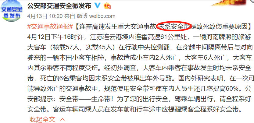 4月12日下午,江蘇連云港境內(nèi)連霍高速61公里處,一輛河南牌照的旅游大客車在行駛中失控側(cè)翻,在穿越中間隔離帶后與對向駛來的一輛本田小客車相撞,事故造成小車內(nèi)2人死亡,大客車6人死亡,大客車內(nèi)其余乘客不同程度受傷。經(jīng)初步調(diào)查,大客車內(nèi)乘客在事故發(fā)生時均未系安全帶,死亡的6名乘客均因未系安全帶被甩出車外導(dǎo)致。